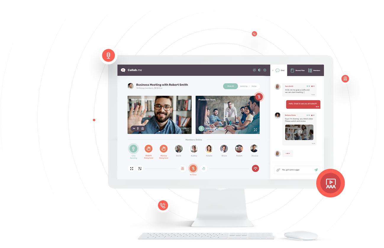 Callab es una herramienta en la que usted es el profesor en la sala: use el modo de altavoz, el uso compartido de documentos, la pizarra y el botón de levantar la mano. Administre su próximo seminario web o clase con facilidad: disfrute de una calidad de video perfecta y todas las herramientas que necesita, todo en una sola plataforma.